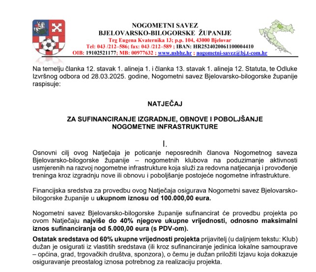 Osnovni cilj ovog Natječaja je poticanje neposrednih članova Nogometnog saveza Bjelovarsko-bilogorske županije – nogometnih klubova na poduzimanje aktivnosti usmjerenih na razvoj nogometne infrastrukture koja služi za redovna natjecanja i provođenje treninga kroz izgradnju nove ili obnovu i poboljšanje postojeće nogometne infrastrukture.